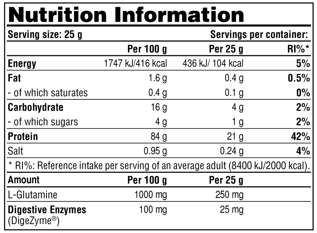 Вкус ванили: смесь сывороточного протеина (два типа изолята сывороточного протеина CFM [из молока , растворимого с лецитином подсолнечника]), смесь аминокислот (L-глицин, L-таурин), смесь ароматизаторов и сливок (сухое обезжиренное молоко , ароматизатор [ваниль]), мальтодекстрин, хлорид натрия, подсластители (ацесульфам К, сукралоза), загуститель (ксантановая камедь).