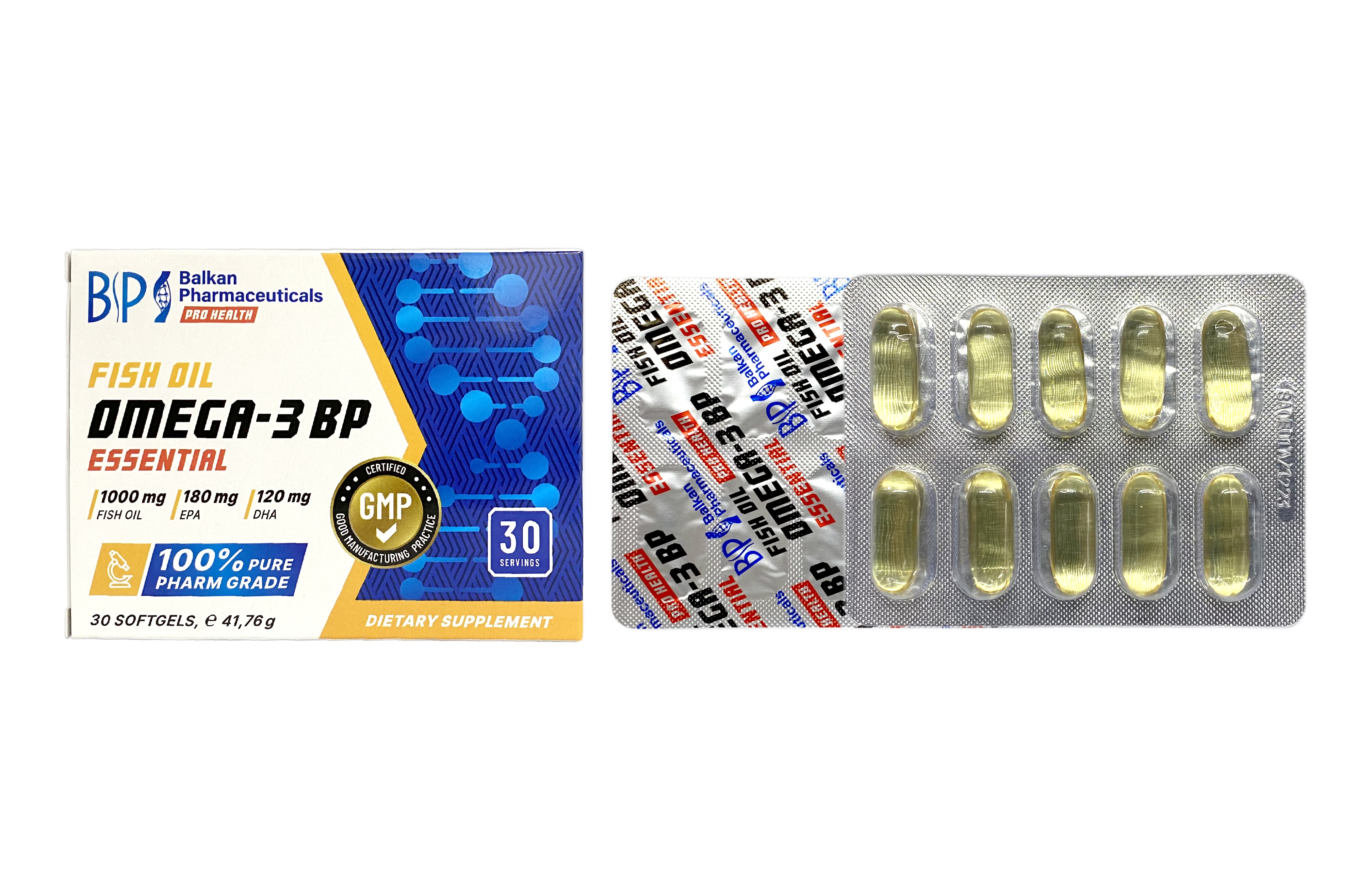 Омега-3 BP Esențiale — мягкие желатиновые капсулы с 1000 мг высококачественного рыбьего жира, включая 180 мг EPA и 120 мг DHA, для комплексной поддержки сердца и мозга. Ежедневная порция восполняет дефицит незаменимых полиненасыщенных жирных кислот, укрепляет зрение и иммунитет. Упаковки на 30–120 капсул позволяют подобрать оптимальный курс приёма под ваши потребности.